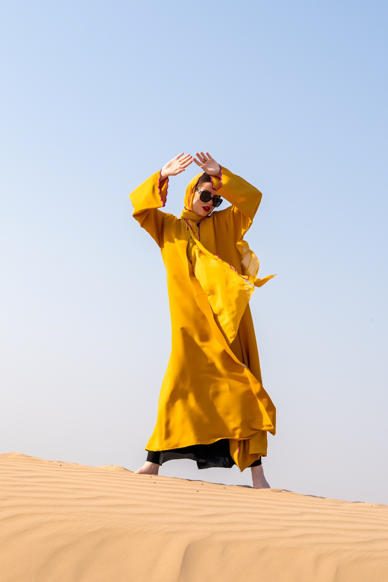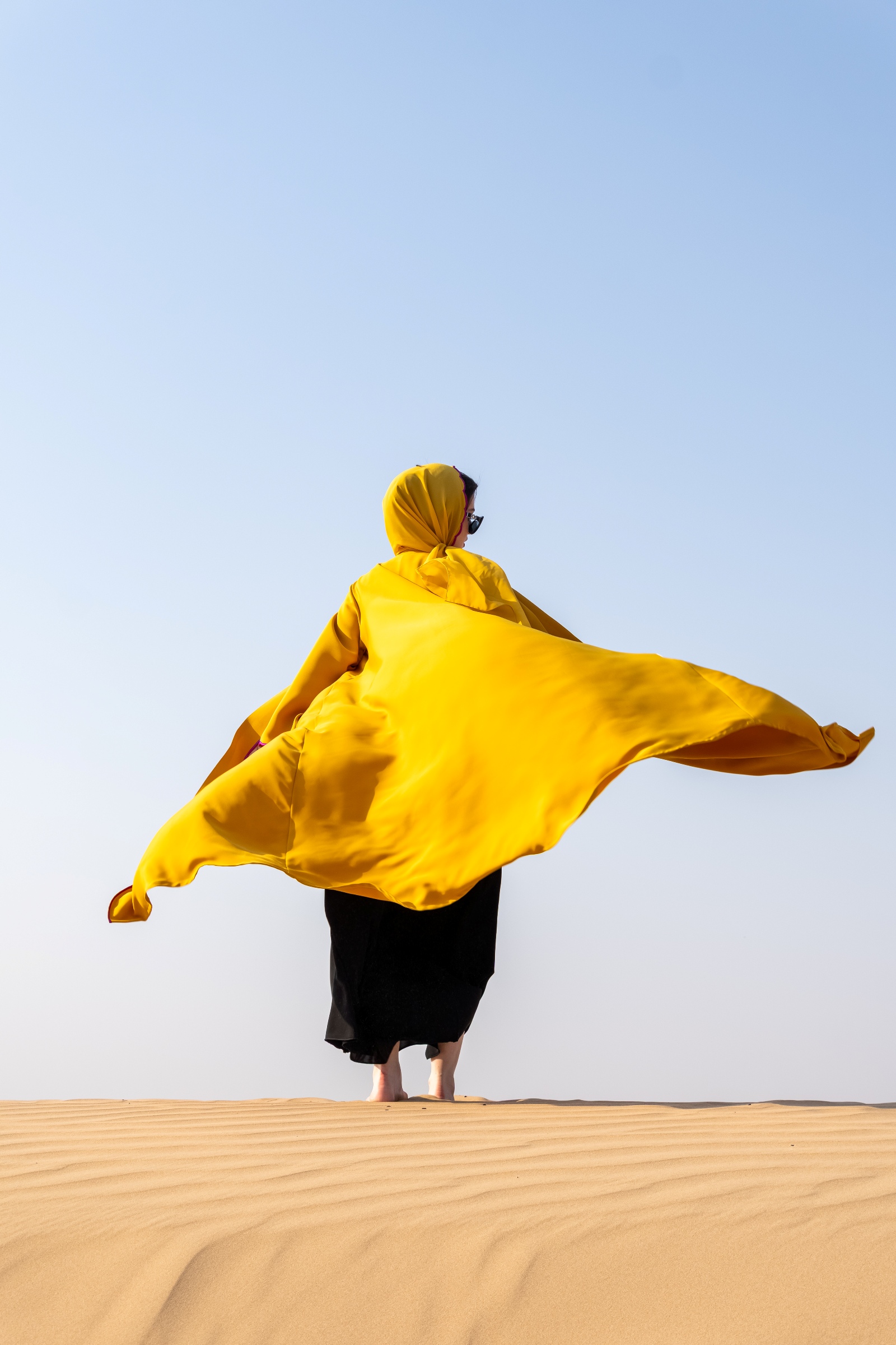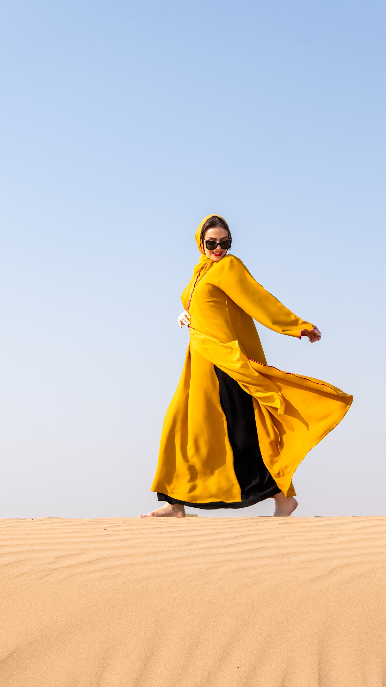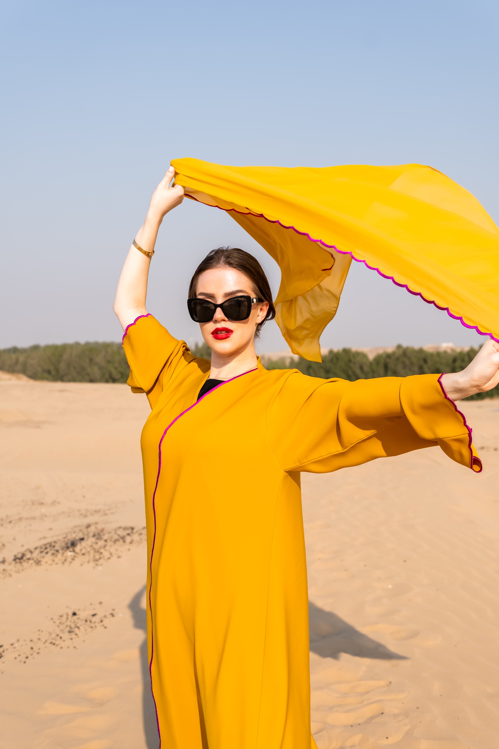 A softly structured abaya with elegant curved detailing and a luminous, flowing finish.