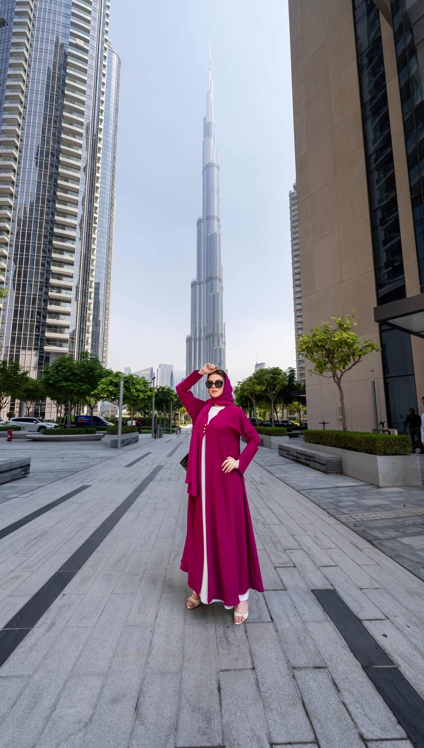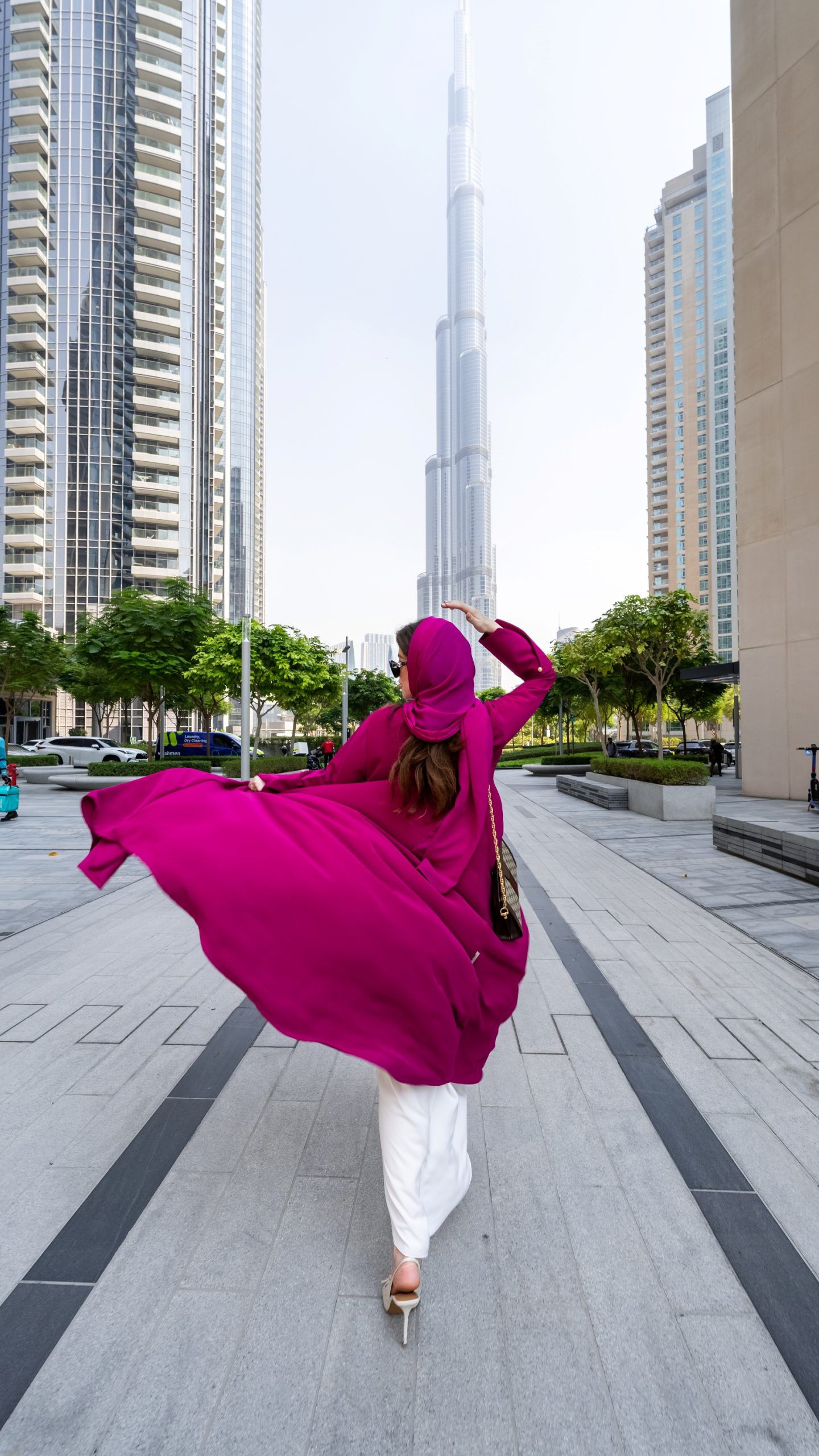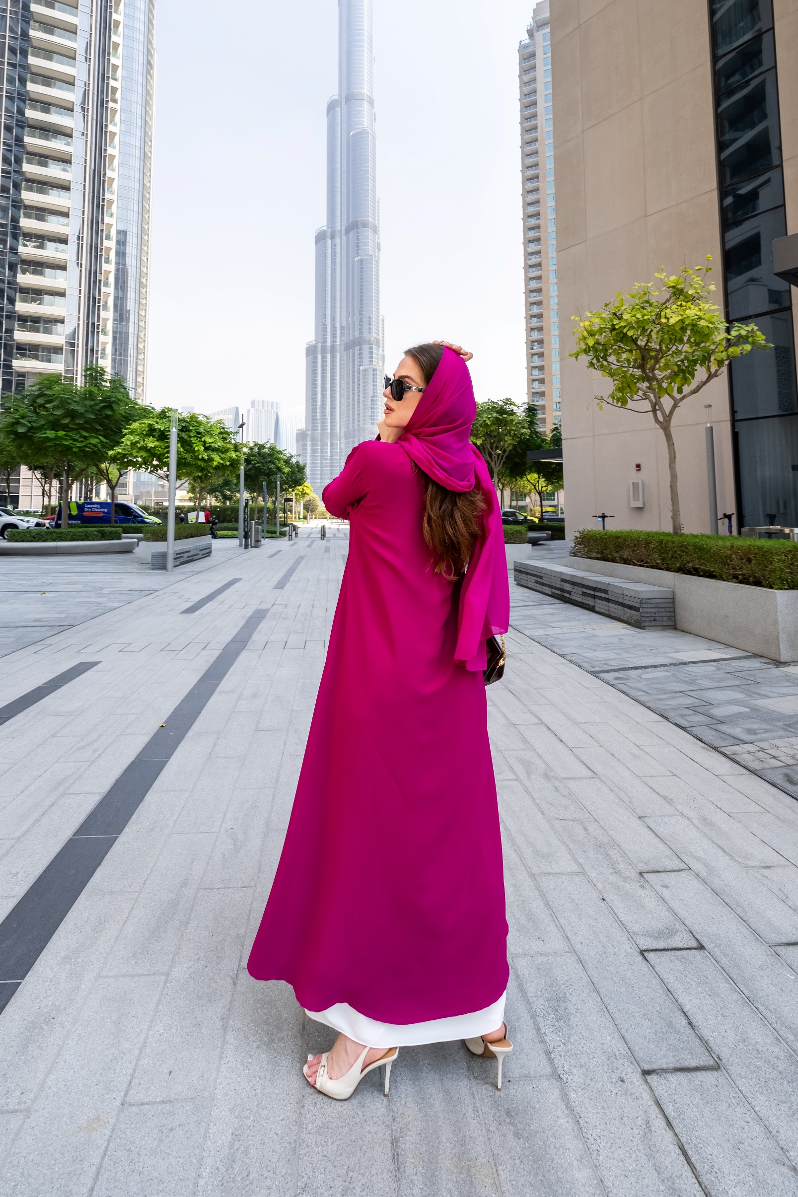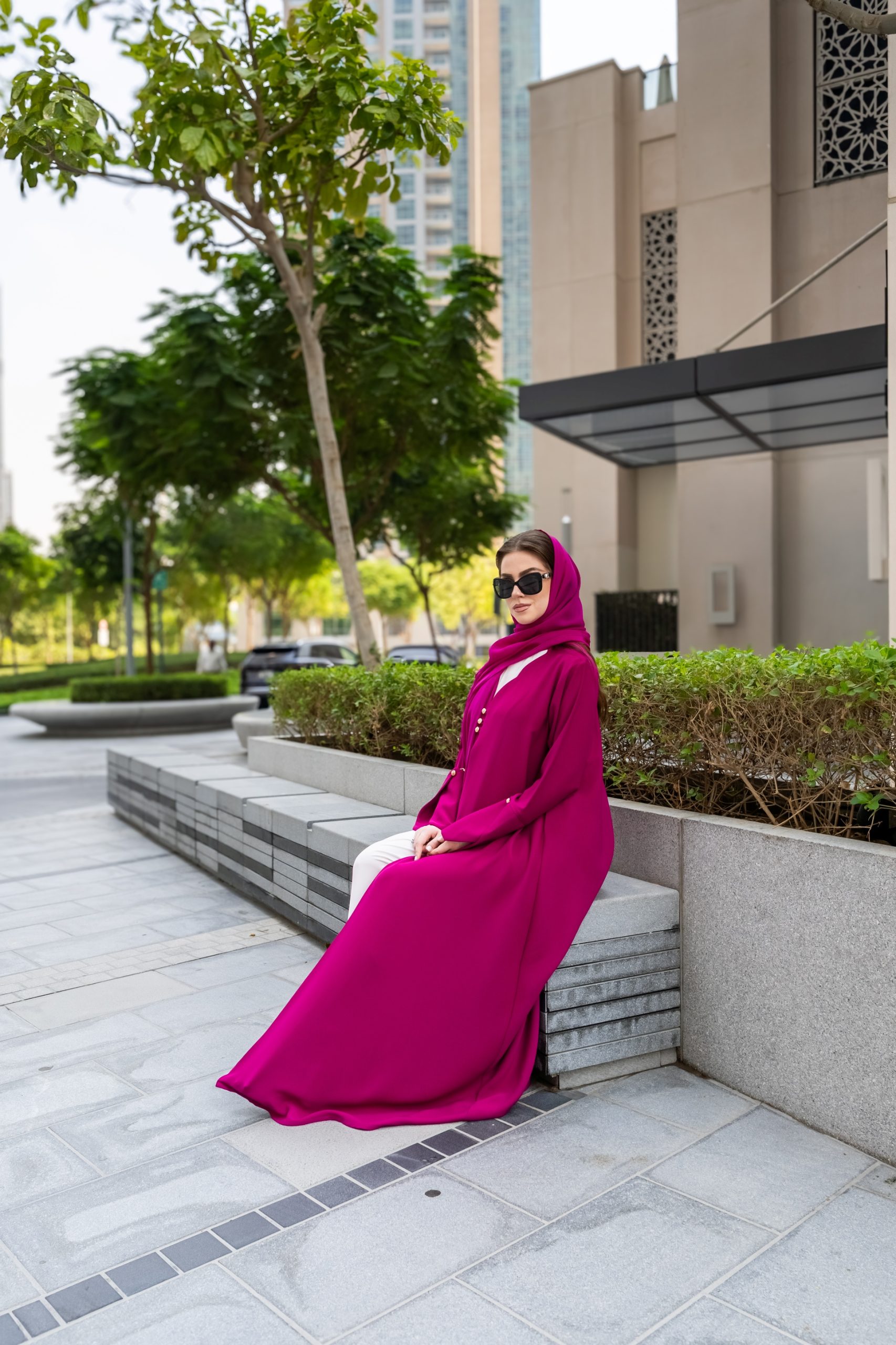 A luxurious fuchsia-toned abaya with a graceful flow, designed to elevate your modest wardrobe with modern elegance.