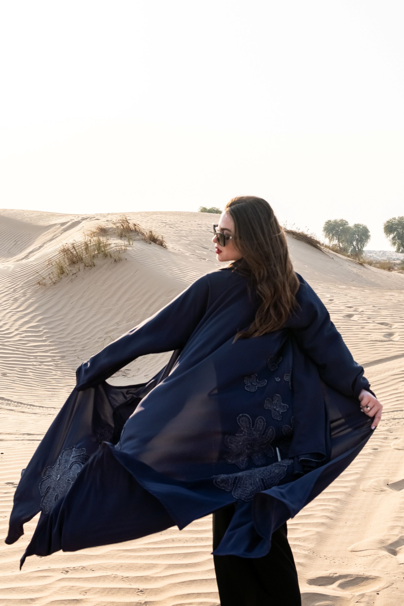 The Navy Bloom Abaya is adorned with elegant floral embroidery, beautifully complementing its deep navy tone.